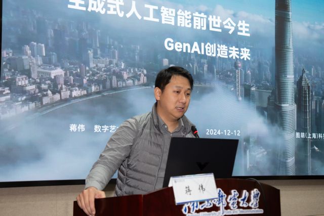 1212日下午,由教务处主办、教育科学与技术学院承办的南京邮电大学“紫金大讲堂”——企业家讲座第一百五十四次活动在仙林校区中天报告厅举行。图萌(上海)科技有限公司数字艺术总监蒋伟先生莅临本次活动,并作题为“生成式人工智能从前世到今生”的讲座。讲座由卢锋院长主持。